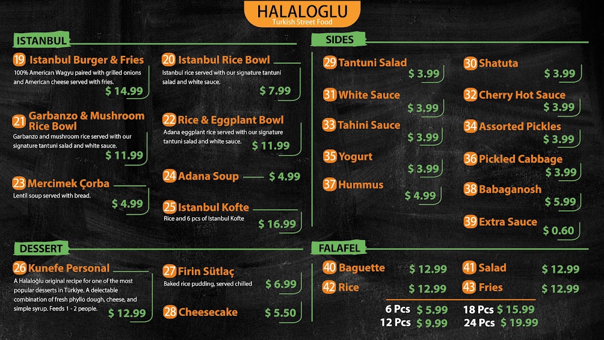 Welcome to Halaloglu, a delightful Turkish restaurant located in Fountain Valley, CA. Renowned for its authentic flavors, Halaloglu presents a menu that reflects the heart of Turkish cuisine. Highlights include the Istanbul Burger, featuring 100% American Wagyu beef paired with savory grilled onions and American cheese, all served with crispy fries for $19.73.